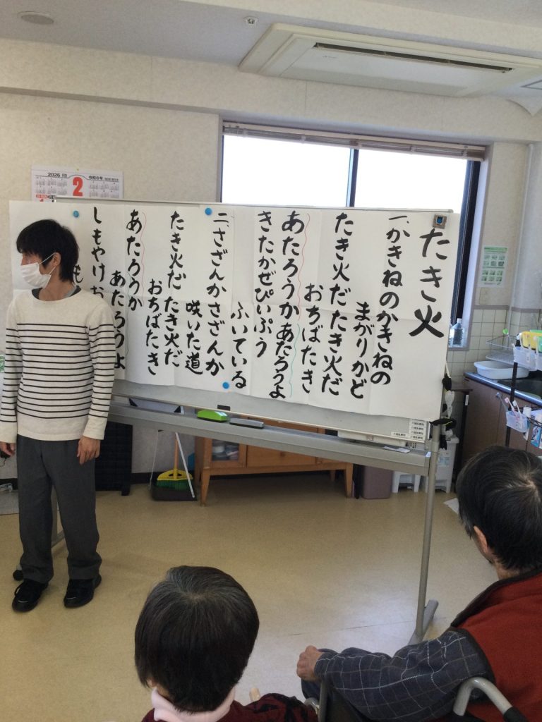 TOPICS ホーム TOPICS 2026.02.05 介護医療院 久しぶりの音楽療法でした! インフルエンザ蔓延防止の為12月と1月と中止にしておりました音楽療法を行いました。皆さん非常に楽しみにされており、予定より早く始めました。 始まる前に先生とお話をされており、非常に会話も盛り上がっていました。 まだ寒い日が続いていますので、温かい気持ちになれるように歌詞を読んで、このような状況ですねと想像しながら歌っていきました。 先生のピアノのメロディーも心地良くスヤスヤと眠られてしまわれる方もいらっしゃいました。 大きな声で歌われております! 3月の音楽療法は卒業の歌を歌っていきますよー! 前の記事 記事一覧へ “介護医療院”その他の記事 2026.02.03 今年も節分の日を迎えました。 介護医療院 2026.01.24 誕生日おめでとうございます。 介護医療院 記事カテゴリー お知らせ 内科 ひふ科 介護医療院 訪問看護 デイサービス 居宅介護支援 よくある質問 空室状況案内 採用情報 最新の記事 2026.02.05 久しぶりの音楽療法でした! 2026.02.03 今年も節分の日を迎えました。 2026.01.24 誕生日おめでとうございます。 2026.01.01 新年あけましておめでとうございます。 2025.10.01 白玉点滴(グルタチオン600mg)あります