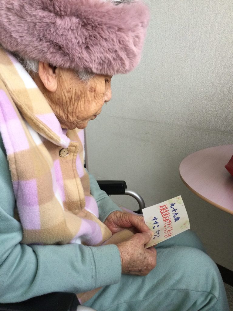 TOPICS ホーム TOPICS 2026.01.24 介護医療院 誕生日おめでとうございます。 先日の22日にお誕生日を迎えられ御年99歳となられました。 面会制限がある為、ご家族とお会いする事は出来ませんでしたが、娘様より「元気な姿を孫達にも見せたいので」 と写真掲載させていただいています。 寒がりでしたので、フカフカの暖かい羽織物のプレゼントはピッタリでした! 娘様達の名前を見られていらっしゃいました。 「あたしはの誕生日やったけな?」と最初はピンときていなかったようです。(笑) 前の記事 記事一覧へ 次の記事 “介護医療院”その他の記事 2026.02.03 今年も節分の日を迎えました。 介護医療院 2026.01.01 新年あけましておめでとうございます。 介護医療院 記事カテゴリー お知らせ 内科 ひふ科 介護医療院 訪問看護 デイサービス 居宅介護支援 よくある質問 空室状況案内 採用情報 最新の記事 2026.02.03 今年も節分の日を迎えました。 2026.01.24 誕生日おめでとうございます。 2026.01.01 新年あけましておめでとうございます。 2025.10.01 白玉点滴(グルタチオン600mg)あります 2025.09.30 インフルエンザ・コロナワクチン接種開始のお知らせ