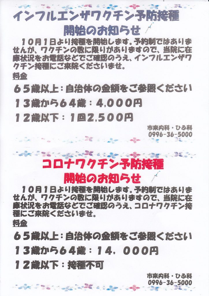 TOPICS ホーム TOPICS 2025.09.30 お知らせ インフルエンザ・コロナワクチン接種開始のお知らせ インフルエンザワクチン・コロナワクチン予防接種の開始のお知らせ 前の記事 記事一覧へ 次の記事 “お知らせ”その他の記事 2025.10.01 白玉点滴(グルタチオン600mg)あります お知らせ内科ひふ科 2025.06.19 8月2日(土)ひふ科受付時間短縮のお知らせ お知らせひふ科 記事カテゴリー お知らせ 内科 ひふ科 介護医療院 訪問看護 デイサービス 居宅介護支援 よくある質問 空室状況案内 採用情報 最新の記事 2025.10.01 白玉点滴(グルタチオン600mg)あります 2025.09.30 インフルエンザ・コロナワクチン接種開始のお知らせ 2025.09.15 敬老の日おめでとうございます。 2025.08.03 面会制限 一部緩和のお知らせ 2025.07.03 7月の音楽療法でした!